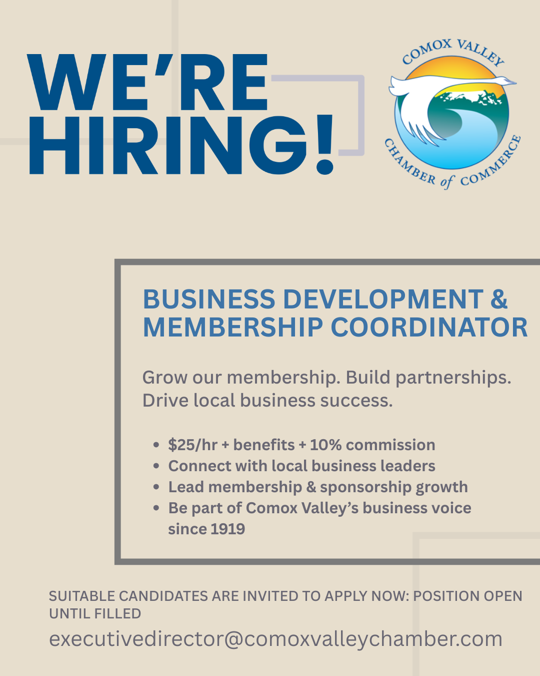 If you're passionate about making a meaningful impact and contributing to the economic vitality of the Comox Valley, we're looking for you! Come join our dynamic team dedicated to fostering a vibrant business community.