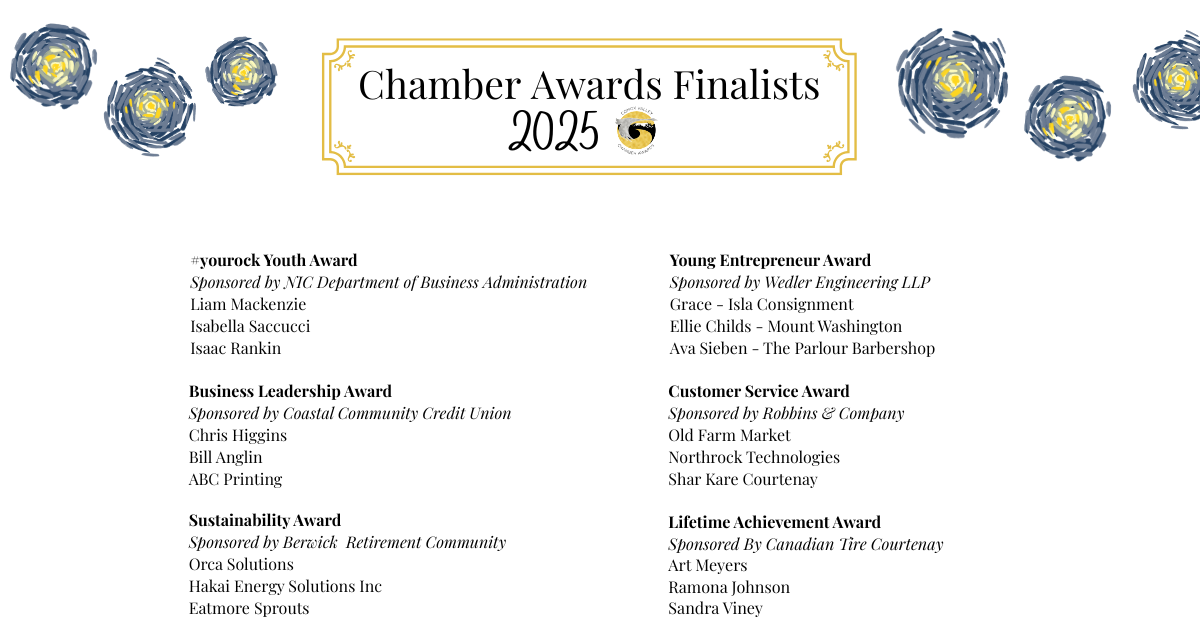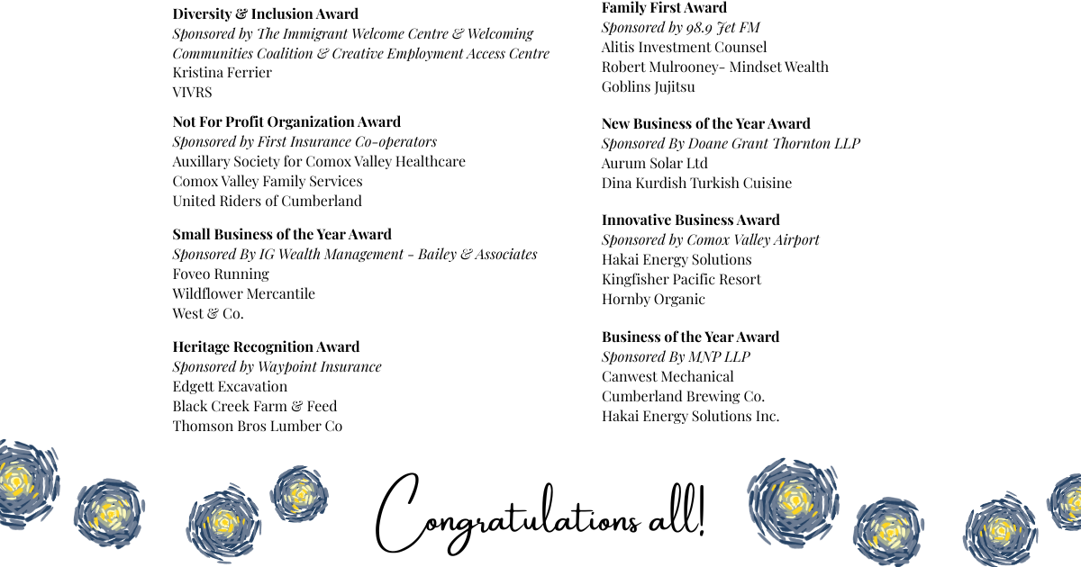 The Comox Valley Chamber of Commerce Chamber board and staff are thrilled to celebrate the businesses and individuals in the following categories that make the Comox Valley a great place to work and play. There are 14 categories to nominate in and 15 Awards in total.